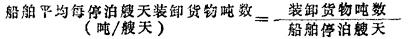| 释义 | 船舶平均每停泊艘天装卸货物吨数 又称船舶装卸总定额。在港停泊的船舶平均每艘每停泊一天实际装卸的货物吨数。其计算公式为: