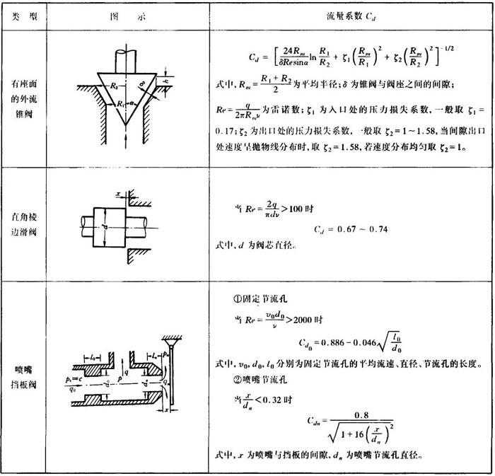 在液压系统中广泛地应用节流器或阻尼小孔来控制流量或压力,如图1.1-4为薄壁节流小孔的流动,它就是伯努利方程的具体应用。 (1)节流公式 对于低粘度液体通过薄壁小孔口作近似计算时,常取 Cc≈0.62~0.64 Cv≈0.97 ζ≈0.06 Cd≈0.6~0.61 (3)液压阀口的流量系数 在液压阀的设计和计算时,流量的计算就是应用节流公式(1.1-8),计算中Cd是个关键的数值。而阀的种类和形状较多,不同的液体通过不同阀口时,使阀内流动变得更复杂了。故阀的Cd不能一般而论。现将部分学者实验研究结果汇集于表1.1-3。 表1.1-3 液压阀的流量系数  |