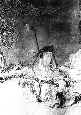 【作品赏析】: 《苏武牧羊图》描绘的是西汉大臣苏武坚贞爱国的故事。 天汉元年(前100年),苏武奉汉武帝之命出使匈奴被扣,不顾胁迫,拒绝投降,被迁北海(今贝加尔湖)边牧羊。他杖汉节牧羊,卧起操持,节旄层脱。在匈奴十九年,历尽艰辛,坚贞不渝,表现了崇高的爱国精神,历来为我国人民所敬仰。 黄慎这幅画采用了半工带写的笔调,写实性较强。他以选取典型环境烘托人物形象的手法,给人以强烈的感染力。冰天雪地,一棵积满冰雪、枝杈枯萎的老树,在寒风中颤抖,似乎大地都被冻僵了,这是漠北最令人害怕的酷境。 处在这样恶劣环境下的苏武已是一个鬓发、眉须尽白的老者。他身著汉装,双手紧握汉节,泰然自若地注目著脚旁互相偎依的羊群,似乎又陷入思国思家的沉思中。 节旄尽脱的汉节,苏武蓬松的银须,伤痕瘢剥却坚劲无比的老树等,都能引起读者对这位爱国者坚贞不屈精神的联想。 这幅画的布置很特别,画面天地各一半,树干横卧,与人物成直角交错,造成元宝(或凸字)形,使主体突出,结构稳定。人物、绵羊、老树的造型都非常写实,表现了深厚的艺术技巧和功力。。  清 黄慎 轴 绢本 |