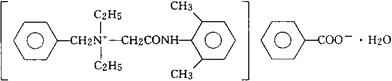 C28H34N203·H2O=464.60 CAS-86398-53-0 CAS-3734-33-6 N-[2-[(2,6-二甲苯基)氨基]-2-氧乙基]-N,N-二乙基苯甲铵苯甲酸盐一水化合物。 Benzenemethanaminium,N-[2-[(2,6-dimethylphenyl)amino]-2-oxoethyl]-N,N-diethy-,benzoate,monohycdrate. 苄二乙基[(2,6-二甲苯氨基甲酰)甲基]钠苯甲酸一水化合物。 Benzyldiethyl[(2,6-xylylcarbamoyl)methyl]ammonium benzoate monohydrate. 药用辅料。 地那铵苯甲酸盐。 Denatonium Benzoate,NSC-157658. INN,USAN.