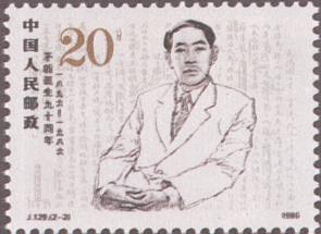 | 释义 | 茅盾诞生九十周年 发行日期:1986年7月4日 齿孔度数: 印刷版别:影写版 票幅:40×30 全张枚数:50(5×10) 设计者:吴长江 印刷:北京邮票厂