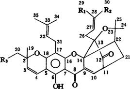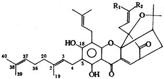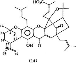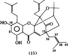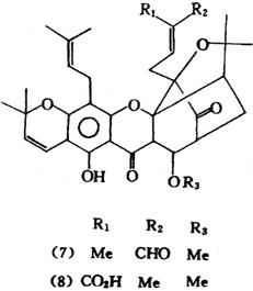 | 释义 | 藤黄 【概况】: 异名 玉黄、月黄(《中药大辞典》)。 基源 为藤黄科藤黄属植物藤黄和印支藤黄的胶质树脂。 原植物 藤黄Garcinia morella Desr.(G.indica Chois)和印支藤黄G.hanburyi Hook.f. 历史 本品始载于《海药本草》,列于木部。李时珍列入《纲目》草部,并曰:所用之藤黄,皆经煎炼成者,舐之麻人,乃树脂也……,番人以刀斫树枝滴下,次年收之。所述即为进口的藤黄无疑。 形态 常绿乔木,高约18m。小枝四棱形。叶对生,叶柄长8mm;叶片薄革质,椭圆状卵形或卵状披针形,长10~15cm,先端钝,基部楔形,全缘。花单性,无柄,黄色;雄花2~3簇生叶腋,花萼与花瓣均4片,圆形,雄蕊多数,集合成一近球状肉质体,花药1室,横裂,花丝短:雌花单生,较大,具退化雄蕊12枚,基部合生,子房4室,无毛,柱头盾形。 浆果近球形,直径约2cm。 种子4枚。花期11月,果期翌年2~3月。(图见《中药大辞典》.下册.2695页.5655条图) 生境与分布 生于热带地区,中国不产,广东和广西有少量栽培。 分布于印度和泰国。 印支藤黄与藤黄的区别在于:叶柄长7~18mm;雌花1~3簇生,花梗长10~12mm,雄蕊集合成2~3束。(图见《印度支那植物志》.第3册.312页.图30∶1~3)。分布于越南、柬埔寨,泰国和老挝。 。【生药】:采集 在开花前,于离地约3m处将茎干的皮部作螺旋状的割伤,伤口内插一竹筒,盛受流出的树脂,加热蒸干,用刀刮下,即为藤黄。 又名玉黄、月黄。药材产于印度及泰国。 鉴别 本品为管状或不规则的块状物,直径3~5cm,显红黄色或橙棕色,外被黄绿色粉霜,有纵条纹。 质脆易碎,断面平滑,呈贝壳状或有空腔,具黄褐色而带蜡样的光泽,用水研和则呈黄色乳剂,投入火中则燃烧。 气微,味辛辣。以半透明、红黄色者为佳,黑色者次之。 加工炮制 制藤黄,取豆腐一块置盘中,中间挖一不透底的槽,放入藤黄,再用豆腐盖严,置笼中,蒸至藤黄溶化,取出放凉,待凝固后,取出藤黄,晾干。每藤黄100kg,用豆腐400~500kg。 贮藏 置阴凉干燥处,防潮。 。【化学】:藤黄属植物分布越南、泰国、印度等热带地区,中国广东海南一带有引种;多含呫吨酮类(Xanthones)及双黄酮类化合物。 如印支藤黄树(Garcinia hanburgi Hook.f.)及桑藤黄树(G.morella Desr.)的树干,经割伤后流出的树脂,干燥后商品称为藤黄(Gamboge)。中药“藤黄”中树脂占70%~80%,树胶占15%~25%;除药用外,常作为绘画黄色画料[1]。 藤黄中的呫吨酮类化合物多有抗Hela及HEL细胞毒活性;其中主成分为藤黄酸(Gambogic acid,α-Gambogic acid,β-Guttiferin)(1)、其余有异桑藤黄素(Isomorellin)(2)、桑藤黄酸(morellic acid)(3)、Desoxymorellin(4)、藤黄精(Gambogin)(5)、Morellin dimethyl acetal(6)、Isomoreollin B(7)、Moreollic acid(8)、Gambogenic acid(9)、藤黄精宁(Gambogenin)(10)、Isogambogenin(11)、Desoxygambogenin(12)、Gambogenin dimethyl acetal(13)、Gambogic acid(14)、Hanburin(15)[2,3]。 又曾得到新藤黄酸(Neogambogic acid),即3,4二氢藤黄酸[4,5]。 桑藤黄(G.morella)树脂中有Morellic acid、Isomorellic acid、Desoxymorellin、Morellinol等[1]。