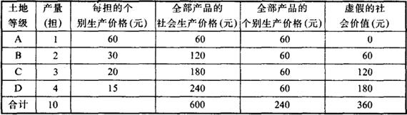 | 释义 | 虚假的社会价值 指农产品中的个别生产价格低于社会生产价格所获得的超额利润,它形成级差地租,是农业中的资本主义关系的必然表现。 在资本主义制度下,由于土地的优劣的差别,对面积相同的土地投资的劳动生产率是不一样的,从而农产品的个别生产价格也有高有低。耕种生产条件较好的土地,劳动生产率较高,而个别生产价格较低;反之,耕种生产条件较差的土地,劳动生产率较低,个别生产价格较高。 但是,农产品的社会生产价格是由劣等地的生产条件所决定的。因此,耕种较好的生产条件的土地,其产品个别生产价格低于社会生产价格,而获得超额利润,形成级差地租,表现为虚假的社会价值。 例如,假定有4块面积相等而肥力不同的土地A、B、C、D,而各块土地投资额均为100元,产量A地是1担,B地是2担,C地是3担,D地是4担,而每担的社会生产价格是60元。这样,每担的个别生产价格A地是60元,B地是30元,C地是20元,D地是15元;每块地的社会生产价格总额A地是60元,B地是120元,C地是180元,D地是240元。总计以上4块土地产量共10担,全部产品的社会生产价格是600元,全部产品个别生产价格是240元,前者比后者贵250%,即高出360元出售。可见,农产品的社会生产价格的总和总是大于农产品的个别生产价格的总和,这个超额部分就是级差地租的总额,它代表的价值则是虚假的。 见下表: