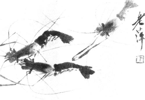 | 释义 | 虾 【作品赏析】: 此图表现虾的形态,活泼、灵敏、机警,有生命力。 为了熟悉虾的各种变化,白石老人在水缸里养著几只大虾,闲时常常仔细地观察虾的游动、跃进、觅食以及体态的各种变化。因为他掌握了虾的特征,所以画起来得心应手。就以画面上的三虾为例:虾头上的三笔,有墨色的深浅浓淡,水分的渗透干湿,而又表现出一种动感。左右一对浓墨眼睛,脑袋中间用一点焦墨,左右二笔淡墨,于是使虾的头部变化多端。硬壳透明,由深到浅。而虾的腰部,一笔一节,连续数笔,形成了虾腰节奏的由粗渐细。用笔的变化,使虾的腰部呈现各种异态,有躬腰向前的,有直腰游荡的,也有弯腰爬行的。虾的尾部也是三笔,既有弹力,又有透明感。 虾的一对前爪,由细而粗,数节之间直到两螯,形似钳子,有开有合。虾的触须用数条淡墨线画出,看似容易,实则极难:画得活,则虾之生命自出;画僵了,也就失去了生命。虾须的线条似柔实刚,似断实连,直中有曲,乱中有序,纸上之虾似在水中嬉戏游动,触须也象似动非动。 白石老人对老舍说:“实际上虾爪上的东西还很多,可是我不用画这些玩意。”可见他画虾不是单纯对实物的摹拟。在用笔上有用侧锋,有用中锋,有用笔根的。落笔有轻重疾迟、起承转合;用墨有浓淡深浅、润湿干燥,尤其宣纸具有渗化迅速的效果,一笔下去不能改动,这要有坚实的笔墨功夫。而白石的用水功夫更是臻妙,他画的虾身似乎永远是湿淋淋的,好象真的生活在水中,一张白纸变成了一溪清水。 这就是白石老人画虾的创造性。 。
