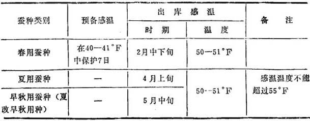 用50-51°F(10-10.5℃)保护,感温所需的时间,一般春用蚕种约12-18日,夏用蚕种和早秋用蚕种(夏改早秋用种)约7-12日。感温期同应解剖胚子,出现丙1胚子后隔日解剖1次,当丙1胚子达到30%时每日解剖1次,丙1胚子达到90%以上时,为入库再冷藏(第2次冷藏,后期冷藏)的适期。对胚子发育不齐的批或品种,可适当延长在41°F中的预备感温时间。夏用及早秋用种出库感温时气温较高,感温中要防止蚕种接触55°F以上的温度。 4.胚子解剖:抽取解剖蚕卵要有代表性,每个样本应抽取20-30粒蚕卵。将配制好的苛性钾液(浓度15-20%)注入烧杯内煮沸,取下烧杯后立即把解剖材料浸入碱液中,约经5-6秒钟蚕卵呈赤豆色时取出,在温水中洗去卵面碱液,再移入盛有温水的培养皿中,用吸管吸水冲射,使胚子与卵壳分离,将胚子用吸管吸出,放在载玻片上,每个样本要取完整的胚子10-15个,用40-60倍显微镜观察,记录胚子的发育阶段及其个数,为适时入库提供依据。 5.催青孵化试验 在甲胚子入库时,以批为单位抽好孵化试验的样本(一般每批2张),比一般大批蚕种早1月左右(浙江约在1月20日前后)出库感温,当多数胚子发育到丙1时入库冷藏,至3月中旬出库,按标准催青,调查孵化率和张种收蚁量,写出书面报告,供蚕种配发时参考。 6.蚕种出库配发 蚕种出库(出内库)后,先在45-50°F(7-10℃)的外库中保护,普通种不少于12小时,原种以上各级蚕种不少于24小时(胚子发育不齐的品种在外库的保护时间可延长到2-3日),然后正式出库(出外库),将蚕种移入低温室中用59-63°F(15-17℃)保护待运。发种由专人负责,凭蚕种配发清单,经发种、领种双方核对无误后出运蚕种。蚕种出运应掌握在丙2胚子时进行,高温时应在早晚出运,力避日中高温。 (三)秋用蚕种的冷藏 1.防病隔离 春制秋用蚕种(毛种)送库时,正值夏用蚕种(净种)大批出库,两类蚕种保护的低温室和出入通道应严格分开,两类不同的蚕种分别放置,防止病原扩散,污染净种。 2.点收蚕种 蚕种送到冷库后,根据送种清单逐批逐架(线架)点收,逐场编号。点收后的蚕种放入低温室保护,温度75-77°F(24-25℃)、干湿差3-4°F(相对湿度约80-85%),避免接触80°F(26.5℃)以上的高温,注意通风换气。 3.适时入库 各类蚕种入库适期见下表。