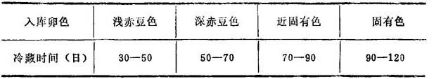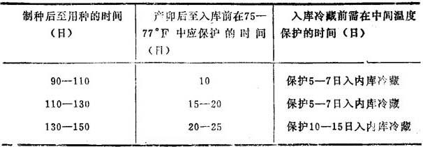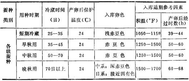 4.冷藏标准 入库后40日以内,冷藏温度以40°F(4.5℃)为中心,40日以后直到出库浸酸以38°F(3℃)为中心,温度上下开差不得超出1°F。各期蚕种的入库冷藏,都要先在外库10-13℃(50-55°F)保护12小时,再入内库冷藏。 (四)黑种冷藏 在长江流域等蚕区,黑种冷藏是作为弥补秋种不足的一种临时措施而采用的。即,当入库秋种数量不足时,采用春制蚕种黑种冷藏法来补足。方法:将产卵后未满10日的原种和产卵后未满30日的普通种,放在中间温度60°F(15.5℃)中保护2-3日,然后入库冷藏,冷藏标准与上述秋用蚕种相同,但冷藏时间宜长,原种不少于60日,普通种要冷藏到晚秋,然后出库浸酸。冷藏时间不足,孵化不齐。 珠江流域蚕区春制秋用和秋制春用二化性蚕种多采用固有色冷藏(黑种冷藏)。蚕种入库前,在68°F以上温度中保护的时间越长,蚕卵滞育程度就越深,解除滞育所需的冷藏期也越长。入库适期要根据用种日期区别对待,适当伸缩,一般来说,早用种早入库,迟用种迟入库(见下表)。