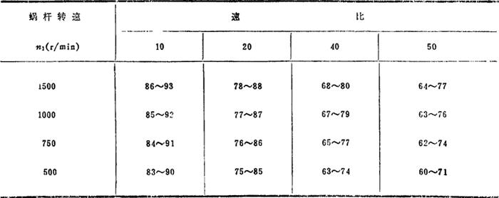 蜗杆传动效率的理论值为:  式中 (蜗杆主动),或 (蜗轮主动),为蜗杆副啮合效率,其中γ为分度圆柱导程角;ρ为啮合摩擦角;η2=0.99~0.98,为轴承效率;ηs=0.96~0.99,为搅油效率。 实际上,影响蜗杆传动效率因素很多,如蜗杆类型,蜗杆副材料组合,齿面精度和齿面粗糙度,装配质量,润滑油的品种、性质和油量,齿面滑动速度等,因而其精确值很难以计算求得,只有通过实验获取。初步设计时可选用的估算值见表4.17-2。但选用时应注意:环面蜗杆传动效率优于圆柱蜗杆传动;圆弧圆柱蜗杆传动与渐开线圆柱蜗杆传动效率优于阿基米德蜗杆传动;磨削蜗杆优于铣制蜗杆;锡青铜蜗轮优于铝青铜蜗轮;合成油优于矿物油;低粘度优于高粘度;充分跑合过的蜗杆优于未经跑合的蜗杆。以上均以啮合正确为先决条件。装配不良,啮合偏置,会使传动效率与承载能力大幅度下降。 表4.17-2 蜗杆传动效率η%(估算值)  |