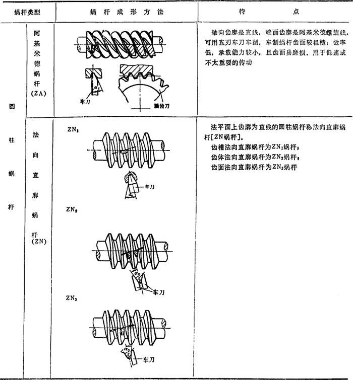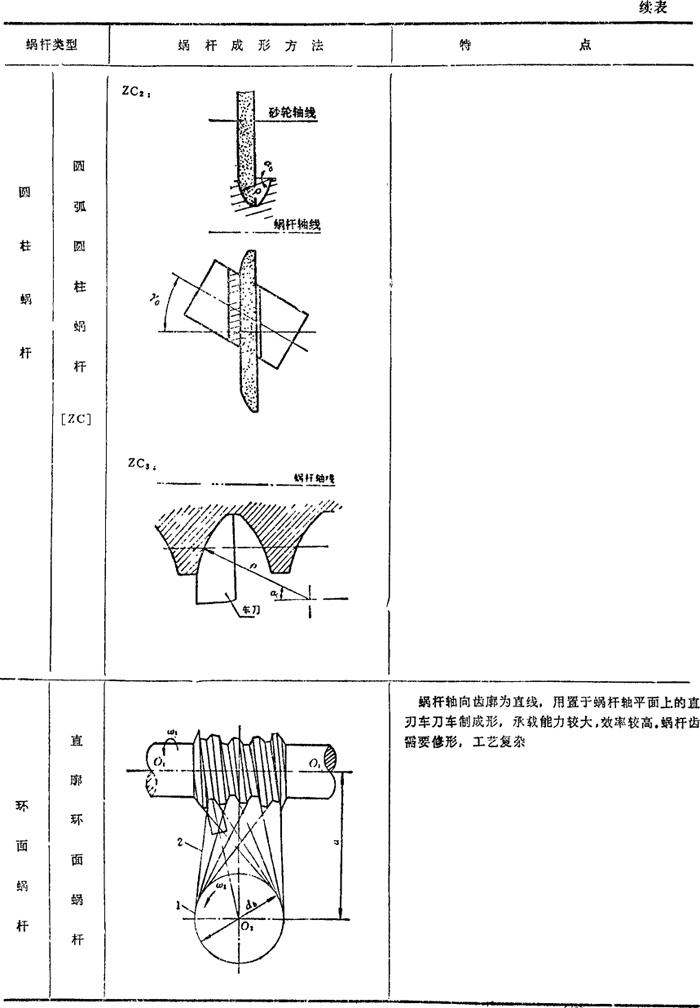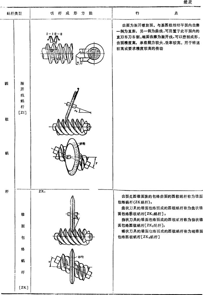 蜗杆传动是用以传递两交错轴间的运动和转矩的啮合传动,常用于两轴轴交角∑=90°的减速传动或增速传动。蜗杆传动的主要特点是:1.单级传动比大,结构紧凑;2.传动平稳,噪声小;3.蜗杆与蜗轮啮合齿面摩擦损耗较大,传动效率较低于齿轮传动,齿面易磨损、粘著与胶合。 常用的蜗杆传动如图4.17-1所示,有圆柱蜗杆传动(a)、环面蜗杆传动(b)及圆柱蜗轮—蜗杆传动(c).蜗杆齿面形成方法决定蜗杆齿面形状。按蜗杆齿面形状不同而分的蜗杆类型见表4.17-1(蜗轮均由蜗杆滚刀滚切成形)。 表4.17-1 蜗杆类型和成形方法      |