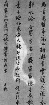 【简介】: 现代·沈尹默书。纸本。行书。五言律诗一首。凡四行,共六十六字。刊于《民国时期书法》(上)。 【赏析】: 唐朝人评褚遂良书“字裏金生,行间玉润,法则温雅,美丽多方。”现在看到沈尹默这张字之后,不觉自然而然的也产生了这种感觉。 他是得力于学褚字的,这一张似乎又增了唐人摹《兰亭序》的笔法。 他提倡写墨迹,这是因爲近代照像印刷术发明以后,自然产生的现象。否则历代书法名迹,或藏在深宫,或价値千金,一个普通的人学写字,是不可能想像借以来学习古人笔法的。 包世臣说褚遂良创造“裹笔法”,就是说第一笔笔势未完,又接下来写下笔。这实在是书写要求迅速而自然产生的结果。在沈尹默这张字中,首行“见”字、“高”字,二行“蜀”字转笔都用此法。 这张字是沈尹默早年的作品,沈尹默书法以功力取胜,所以晚年的字,比这张还要好得多。