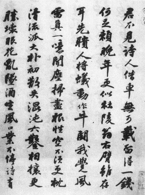 【简介】: 宋·苏轼书于元丰元年(1078)。搨本。145×84.7cm。刊于日本《中国书道全集》(五)。 【集评】: 明《潜山堂金石文跋尾》:“比之蔡君谟有过之无不及,坡公最用意之作也。”明王世贞《弇州山人稿》:“结法不能如《罗池》老笔,亦自婉润可爱。” 【赏析】: 人们通常认爲苏轼书法的特点是以肥厚取胜。但纵观他的全部作品便知并非完全如此。有一部分“酒酣放浪,意忘工拙,字特劲瘦”;还有一部分则“神肥形不肥”,旣有浓郁的苏字风味,又丝毫令人感受不到明丰坊所讥“扁阔肥浊,猥俗可厌”的弊病。《表忠观碑》即属后者。 从整体上看此碑,由于字形多右耸之故(尤其碑的后半部分),使得字与字之间显得气韵连贯,方整而不板滞。全碑笔画劲健遒美,颇承唐碑余緖。用笔上,不少地方参以具有鲜明苏字风格的行书笔意,如捺画的普遍开张飞动,第四行“子”字竪鈎的圆润潇洒,第七行“德”字心部的丰腴紧密,倒数第二行“视”字弯鈎的任情率意等等,充分地表现出苏轼那种旣出于唐人楷法,又不拘于唐人楷法的创造精神。   宋代书家善书碑碣者原本极少,苏轼书此碑时正値“笔老墨秀”的中年。《表忠观碑》虽係石刻,但作者书法上“写”的笔墨情趣,生动滋华的书卷之气充溢字裏行间,这也是使得此碑弥足珍贵之所在。 |
