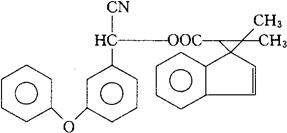 C28H23NO3=421.49 CAS-60148-52-9 3,3-二甲基螺[环丙烷-i,i′[1H]茚]-2-羧酸,氰基(3-苯氧苯基)甲酯。 3,3-Dimethylspiro[cyclopropane-1,1′-[1H]indene]-2-carboxylic acid,cyano(3-phenoxyphenyl)methyl ester. 3,3-二甲基螺[环丙烷-1,1′-茚]-2-羧酸酯与间苯氧苯乙醇腈成酯。 3,3-Dimethylspiro[cyclopropane-1,1′-indene]-2-carboxylic-acid,ester with m-phenoxymandelonitrile. 杀虫药。 西波滋宁。 Cypothrin,Cl 206,797. USAN.