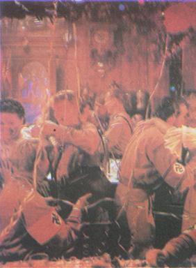 | 释义 | 该诅咒的人 【片头介绍】: 1969 彩色片 150分钟 意大利努莱齐奥制片公司/德国慕尼黑庇什伯影片公司联合摄制 导演:卢奇诺·维斯康蒂 编剧:尼可拉·巴达鲁克 恩利科·梅迪奥尼 卢奇诺·维斯康蒂 摄影:阿尔芒多·南努吉 帕斯戛勒·德·桑蒂斯 主要演员:迪克·鲍嘉(饰弗雷德里克·布鲁克曼) 英格丽·杜林(饰索菲·冯·埃森拜克) 赫尔默·格里厄姆(饰阿申巴克) 赫尔默·贝尔热(饰马丁·冯·埃森拜克) 【剧情简介】: 第二次世界大战前,埃森拜克家族是德国赫赫有名的钢铁世家。 希特勒领导的国社党上台后,这个家族逐渐呈现出衰微征兆。野心勃勃的纳粹首领,为了牢固地把钢铁和军火生产控制在自己手中,有计划地对这个家族进行了分裂和渗透。 影片开始时,成群的仆人在一间豪华的大厅中布置宴会餐桌。 这一天是步入晚境的钢铁大王的生日。两个可爱的小姑娘正在女管家指导下背诵献给祖父的生日贺词。·次子康士坦了正在沐浴,他是纳粹褐衫党一个重要头目,他的儿子正在排练大提琴,他也要为祖父的生日献上一曲。弗雷德里克是已故长子的内弟,他和表弟阿申巴克正从钢铁厂赶来参加晚宴,他是生产技术厂长,阿申巴克是党卫军军官,两个人在汽车里议论著钢铁公司的前景。阿申巴克向他透露了纳粹总部的意图,劝他当机立断,设法掌握公司领导权。 在进入演奏厅的门口,阿申巴克说:“也许今晚就是最好的时机。”弗雷德里克心领神会,但并未做声。 舞台上,长孙马丁身著袒露女装,正在阴阳怪气地唱歌。这时传来了所谓共产党纵火国会大厦的消息。 面对突变的风云,老谋深算的钢铁大王预感到事态严重。为了适应形势,他在自己的生日宴会上当众宣布,任命康士坦丁为公司副总裁。老人的决定激怒了思想激进的赫贝尔,他是二女儿的丈夫。听到共产党火烧国会大厦时,他就说这是一个阴谋,现在又要任命新纳粹的康士坦丁掌管公司大权,他说这种趋炎附势的结果只能导致公司破产。 他在讲了言词激烈的一番话后,怒气冲冲地离席而去。生日宴会也不欢而散。 阿申巴克坐山观虎斗,弗雷德里克坐在一旁不发一言。 嗜玩女童的马丁以玩捉迷藏游戏为名,躲在大钢琴下面亲吻天真无邪的小姑娘。 突然,纳粹士兵夤夜敲门,前来搜捕有严重亲共倾向的赫贝尔。弗雷德里克装作关心备至的样子,让他把手枪留下,赶快跳窗逃走。赫贝尔虽得以逃生,钢铁大王却被人用这只手枪射杀身亡。警方以手枪为证,通缉在逃凶犯赫贝尔。 这一夜埃森拜克府邸乱作一团,公司总裁职位突然竟告阙如,争权夺势的良机刻不容缓。康士坦丁认为自己升任总裁顺理成章,但是公司的股权全部由钢铁大王的长孙马丁继承,总裁的任命必须由他决定。 钢铁大王已故长子的遗孀索菲是一个马克白式的女人,她朝思暮想如何掌握公司大权。 公公暴死,实是天赐良机。 弗雷德里克是她的情人,与之密谋后,决定让她的儿子马丁当夜立即宣布弗雷德里克出任公司总裁。对于这一决定,康士坦丁暴跳如雷,他公然宣称他怀疑杀死钢铁大王的不是逃亡中的赫贝尔,而是弗雷德里克。 弗闻此言,如坐针毡,无言以对。幸有索菲在旁解围,康士坦丁愤愤而去。 天空乌云密布,暴风雨即将来临。 索菲和弗雷德里克篡夺公司领导权后,忠实地执行著德国纳粹司令部的各项指令,为其发动战争所需的军火研制工作竭尽全力。然而,当阿申巴克试图为国防部挪用公司资金时,身为公司副总裁的康士坦丁从中作梗。阿申巴克认为搬掉这块绊脚石已势在必行,所以在一场黑衫党和褐衫党内部火拼时,弗雷德里克在混乱中,乘机把醉得不省人事的康士坦丁射杀。 铲除异己后独揽大权的弗雷德里克,在家中有颐指气使的索菲撑腰,俨然成了埃森拜克家族的新主人,他飞扬跋扈,不可一世,连掌握股权的长孙马丁也惧他三分。有一次马丁在与女童嬉戏之后,当众在饭桌上被他严厉呵斥,竟然吓得躲在阁楼上三天三夜不敢回家。 他看到弗雷德里克终日与母亲厮混,心中万分愤懑。恋母情结深重的马丁发现,母亲事事都站在她的情夫一边,不再顾惜损害自己儿子的感情和利益,仇恨之心不禁油然而生。 索菲夺取大权之后,伙同弗雷德里克不再事事听命于阿申巴克。因她与弗热恋,对于阿申巴克的殷切追求,竟然不予理会。 这位在幕后操纵一切的党卫军首领,认为换马的时机已臻成熟,理想的人选就是不务正业的花花公子马丁。用这个色厉内荏的蠢材做为傀儡,埃森拜克家族的命运就牢牢地操纵在他的手中了。 阿申巴克发展马丁加入党卫军,不放过一切机会离间马丁与索菲的母子感情。 阿申巴克把被通缉的赫贝尔妻子儿女投入监狱,以诱使赫贝尔自首就擒。 赫贝尔果中圈套,在弗雷德里克、索菲和马丁吃晚饭时,他突然闯回家中,他在向警方自首之前,、向马丁说明了他出逃时的真情。马丁明白了是弗雷德里克向警方告的密,迫使赫贝尔出逃,是他借刀杀人,害死了祖父。 杀死二叔康士坦丁的也是这个衣冠禽兽。而在后台出谋划策的正是自己的生母索菲。 为了报仇雪恨,他强奸了生母,又逼迫弗雷德里克和索菲双双服毒自杀。 在鼓乐齐鸣的晚会上,马丁和党卫军头目群魔狂舞。埃森拜克家族的新主和索菲魂归九天。显赫多时的钢铁世家,除了性变态的马丁,全部亡命。公司大权从此完全掌握在纳粹手中。。 【鉴赏】: 卢奇诺·维斯康蒂