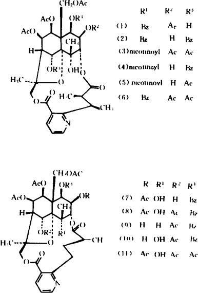 | 释义 | 调经草 【概况】: 基源 为卫矛科卫矛属植物冬青卫矛的根。 原植物 冬青卫矛Euonymus japonicus L.,又名大叶黄杨、八木、正木(《中国高等植物图鉴》)。 形态 常绿灌木或小乔木,高3~8m。 枝有白色皮孔,小枝近四棱形。 单叶互生,具柄,叶柄长0.6~1cm;叶片革质,倒卵形或狭长椭圆形,先端钝或短尖,基部稍狭,有时带楔形,长3~6cm,宽2~3cm,上面深绿色,有光泽,下面色浅,边缘具细锯齿。聚伞花序腋生,总花梗长2.5~3.5cm,一~二回2歧分枝,每分枝顶端有5~12朵花组成为密集的小聚伞花序,花绿白色,直径约7mm,4数,花丝细长;花盘肥大。蒴果近球形,无毛,淡红色,有4浅沟,直径约1cm,果梗四棱形,较粗壮。 每室具种子1~2粒,种子棕色,有桔红色的假种皮。花期6~7月,果期9~10月。(图见《中药大辞典》.下册.1962页.4025条图) 生境与分布 生于山野林缘。中国各地多栽培作绿篱。朝鲜、日本也有。。 【生药】: 采集 全年可采挖根。 【化学】: 根皮中含调经草碱(Euojaponine)A(1),C(2),I(3),L(4),M(5),D(7),F(8),J(9),K(10)和Mayteine(6)、Euonine(11)[1,2]。还含木栓酮和槲皮素[3]。