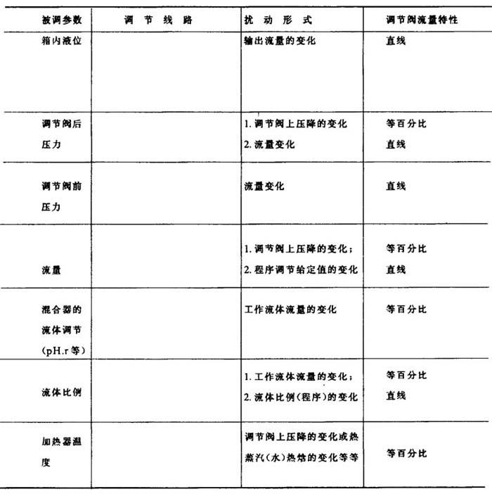 式中 KV——调节阀的放大系数,代表阀的静态特性 K0——对象放大系数 Kc——调节器放大系数值,即比例度δ的倒数 T0——调节周期 T1——调节时间 ξ——系数,对于低浓ξ=1 [讨论]因上式是一常数,即调节阀的静态特性是一个常数,这样应选择直线阀,也就是说,我们应多选择直线调节阀来克服干扰的变化,而使调节过程仍保持应有的衰减程度。 对于其它的简单对象,也可以用这种方法来确定调节阀的流量特性。 2.经验准则法 [说明]在很多实际问题中,既不能获得对象的特性,又不能进行理论的推导,这时计算法就不能有效地应用,可根据经验准则来选择阀门的流量特性。表4-6-12列出了常用系统调节阀特性的经验选定表。 表4-6-12 调节阀流量特性形式选择表