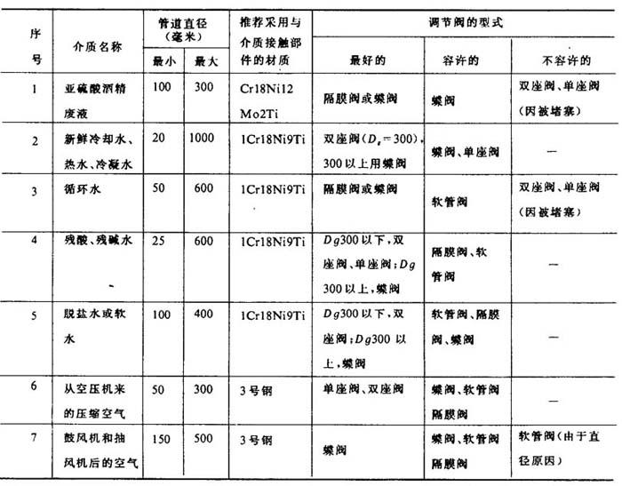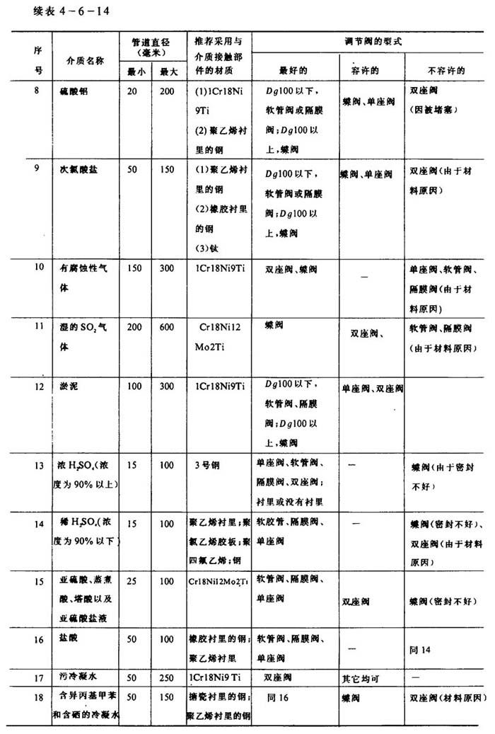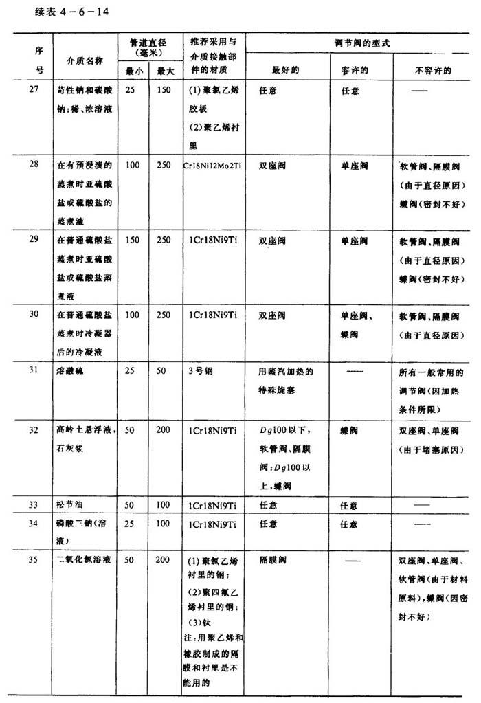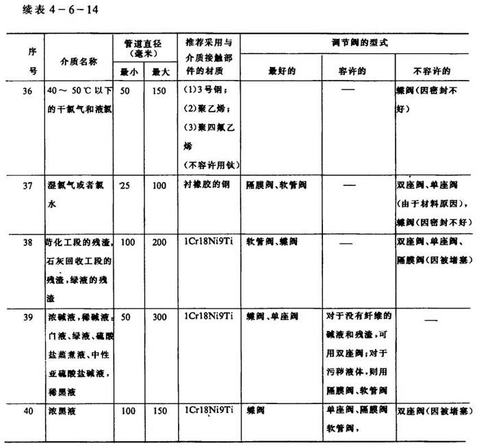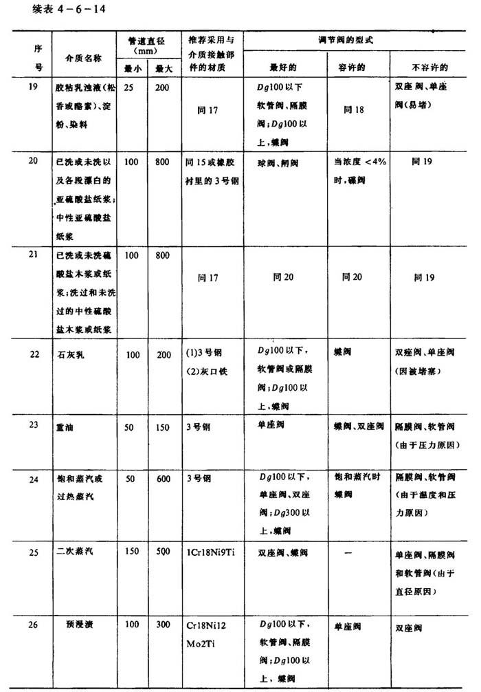 [说明]制浆造纸厂不同介质所采用的调节阀推荐如表4-6-14。