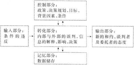 | 释义 | 谈判 在既定环境下,多方达成的一致条件与平衡遭破坏,再行商量解决分歧和矛盾的过程。 其一般模式由五部分组成(如图)。其中关键是转化部分,这也是谈判的过程。输入的信息被编码总结、分类从而作出决定。 在这一部分,更为关键的是信息解释(包括收集)、影响与决策。 控制部分包括政策、决策规划及目标。谈判时,这些规划通过组织间的协商而产生一个详细的目标。效果的反馈也很重要,即谈判各方应保持长期的联系。