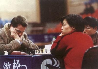 谢军(1970~ ),国际象棋特级大师。 1991年10月29日战胜前苏联著名棋手齐布尔达尼泽,登上了国际象棋女子世界冠军的宝座,成为中国第一个国际象棋世界冠军;这次夺冠也是继1950年以来,国际象棋女子世界桂冠首次游离出苏联本土。2年之后,她以棋后身分卫冕成功,成为当之无愧的“王座”。谢军在比赛中表现出了高超的棋艺和顽强的心理素质;她那“表面波澜不惊,内心惊涛骇浪”的比赛魅力,震撼了每一个参赛者的心。 战绩:1991年10月国际象棋女子世界冠军争夺战,主客场以8.5∶6.5战胜前苏联5届世界冠军齐布尔达尼泽,首次夺冠。1993年11月在摩纳哥的冠军卫冕战上以8.5∶2.5的压倒优势击败格鲁吉亚的约谢利阿妮,轻松卫冕。1996年2月在西班牙哈恩的冠军卫冕战上,以4.5∶8.5负于匈牙利的苏珊·波尔加(大),失冕。 1999年在俄罗斯喀山和中国沈阳进行的国际象棋女子世界冠军争夺战上,以15战5胜7和3负击败俄罗斯棋手加里娅莫娃登上跨世纪王后的宝座。  谢军在比赛中 |