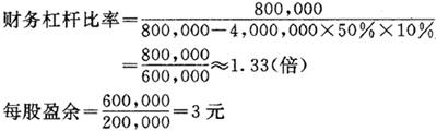 | 释义 | 财务杠杆系数 财务杠杆系数也称财务杠杆比率。它是体现财务风险,衡量财务风险大小的指标。其指标有2种表现形式: (1)适用于评价股份制企业获利能力时运用的财务杠杆比率= (2)适用于评价财务风险及影响普通股东分配利润时运用的财务杠杆比率= 为了计算方便上式可推导= 举例:某股份有限公司全部资本为4,000,000元,负债比率50%(利率为10%),普通股率均数为200,000股,当销售额为4,000,000元,息前税前盈余为800,000元时,该比率计算如下: