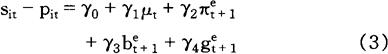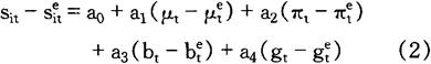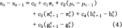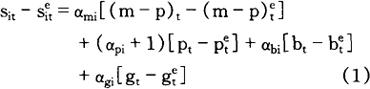 式中各符号的经济含义如下: sit——以本国货币表示的货币i价格的对数 (m-p)t——实际货币供给的对数 pt——价格水平的对数 bt——预算盈余或赤字占GNP比率的对数 gt——政府支出占GNP比率的对数 下列关系式用来取代(m-p)和p: Mt=(1+μt)Mt-1 Pt=(1+πt)Pt-1 式中各符号的经济含义如下: Mt——名义货币存量 Pt——价格水平 μt——名义货币存量增长率 πt——通货膨胀率 因此, mt≈μt+mt-1
