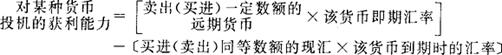 货币投机是指投机者单纯地期望从汇率变动中获利而进行的外汇买卖活动。 投机的先决条件必须有期货交易的外汇市场存在。现汇买卖,由于需持有资金,投机较困难。而远期买卖仅需缴纳少量保证金,无需付现,到期轧抵,使巨额交易投机成为可能。 货币投机的获利能力计算公式为:  例如,投机者预测英镑半年后将贬值10%,即在外汇市场卖出半年后的远期英镑100万,半年后到期时若英镑贬值10%,则按英镑下跌的汇率买进英镑现汇来交割英镑远期,这时获得投机利润为100万×10%=10万英镑。 这种先卖后买的投机又称为卖空。如预测英镑半年后将升值10%,就可采用先买后卖的投机交易同样获取10万英镑,这称为买空。 |