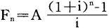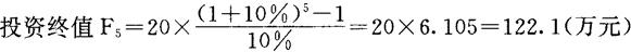式中,Fn为n年末年金终值,A为年金值i和n的含义与前相同。 例:某固定资产投资项目,分5年进行投资,每年末投入资金20万元,5年后项目完工。年利率为10%。项目完工时的投资终值为: