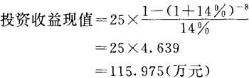 4.年金现金计算 普通年金现值,是指在复利计息方法下,在预定期间内,若干相同间隔期期末收付等额款项的现在总价值。计算公式为: P=A1-(1+i)-n/i=A(1+i)n-1/i(1+i)n 例:某固定资产投资项目,预计今后8年中每年可获得收益25万元,年贴现率为14%,未来投资收益现值计算如下: