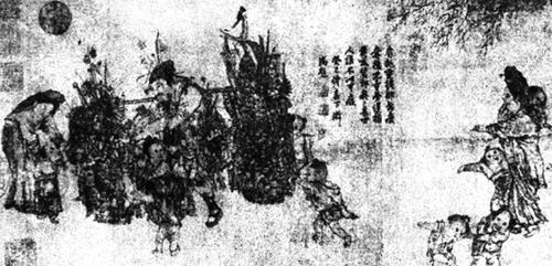 | 释义 | 货郎图 【作品赏析】: 宋画中,除山水、花鸟题材大盛外,人物画亦取得巨大成就。 苏汉臣、李嵩等人面对现实,选取风俗画题,为两宋人物画再添春色。本图为李嵩著名风俗画作品,笔调亲切优美,形象生动自然,在历代人物画作品中亦属罕见。 空旷的村头,草坡伸延,翠柳轻拂,老货郎笑容可掬地挑担摇鼓,缓步走来。 童子们嬉笑著围上前去,有的摸玩货物,有的购买零食,有的露出惊羡的表情,有的呼唤母亲弟妹,欢欣雀跃,煞是热闹。 全画可分为左右两部分。左面共八人:货郎面露微笑,弯腰搁担,一边摇动小鼓;两童子飞奔上去,手臂伸向货担;略后,四孩童已触摸到货物,惊讶、好奇、呆看等表情应有尽有;最左边的妇女正俯身取货给自己的孩子看。 画的右面则为七人,还有大小狗四只:那妇女肩搭小儿,左臂前伸,急匆匆步向货郎;她的身旁,两孩童欢叫吵闹,定要买物;画的前景上另有两童,哥哥刚买下零食,一边大嚼,一边却要拉走迷恋不舍的兄弟;画的最右方,一小童手提葫芦,含指回顾,神情犹疑不决;后面,几只狗吠叫蹦跳,高兴地摇著尾巴。画幅的左右两部分,以妇人、童子的手势巧妙地连接为一体,既可分别观赏,又无割裂的感觉。 整幅画人物虽多,然而神色殊别,姿态不同,聚散自然,疏密有方,互相呼应,气脉贯通始终,富于韵律感。 此画用线勒出,线条细腻雅致,落笔凝重,行笔迟缓发颤,收笔沉著有力,无浮饰之气。 线形以铁线与“钉头鼠尾”融合而成,严整中见骨力,板实里求变化。线的构成组织,皆随人物形体的运动姿势、扭转方向而生变化,或纵或横,或曲或直,顺势勾出,并无固定之法。 对比起来,担子、货物的笔调更为严谨工细,几乎达到纹丝无差的地步,其线不但柔韧圆转,与衣纹的棱角妙成对照,而且结构也较缜密,使画面空白更显虚灵。最后,景色描绘上,画家所用线条又与人物、器具的用笔略有差别,显出山水笔法之风貌,象柳叶皴以乱柴,劲草勒以芦叶,皆随手写出,尤觉洒脱。 。