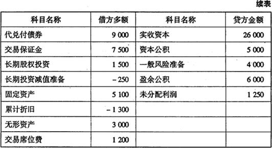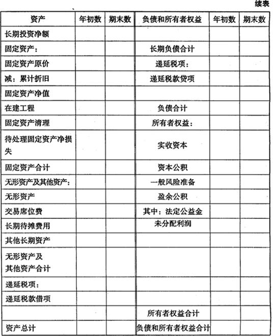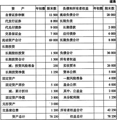 注:清算备付金中客户的清算备付金有6000000元。应付债券中有1000000 元在1年以内到期。盈余公积中包含公益金2000000元。 根据上述科目余额表和资料编制如下资产负债表(表3-4-15): 表3-4-15 资产负债表