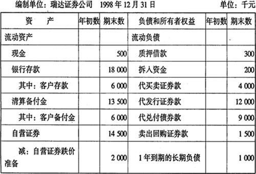 补充资料:代保管证券(面值)__元 (二)资产负债表的编制方法 资产负债表由表头、表身、附注三部分构成。表头部分应列明报表名称(资产负债表)、编表单位名称、编制日期和金额计量单位;表身部分反映资产、负债和所有者权益的内容,是资产负债表的主体和核心;附注部分为补充说明。 1.资产负债表项目的排列 (1)资产负债表左方各项目的排列。 资产负债表的左方一般分为流动资产和长期资产两类。流动资产是指在1年以内或一个营业周期以内将会变现或者耗用的资产,包括现金、银行存款、清算备付金、应收股利、应收利息、应收款项、自营证券、代发行证券、代兑付债券、买入返售证券、拆出资金、受托资产、待摊费用、交易保证金等。长期资产是指在1年以上或超过1年的一个营业周期以上才会变现或耗用的资产,包括长期投资、固定资产、无形资产、交易席位费、长期待摊费用等。 上述项目按照资产的流动性进行排列。流动性强的资产,如现金、银行存款、清算备付金、自营证券等流动资产排在前面,长期投资、固定资产、无形资产、交易席位费等长期资产不容易变现,排在后面。 (2)资产负债表右方项目的排列。 资产负债表右方用以登记负债和所有者权益。负债分为流动负债和长期负债两类。流动负债是指在1年以内或超过1年的一个营业周期以内需要偿还的债务,包括质押借款、拆入资金、应付款项、应付工资、应付福利费、应交税金及附加、代买卖证券款、代发行证券款、代兑付债券款、卖出回购证券款、受托资金等。长期负债是指偿还期限在1年以上或一个营业周期以上的债务,包括长期借款、应付债款、长期应付款等。 所有者权益是指公司投资人对公司净资产的要求权,包括实收资本(或股本)、资本公积、一般风险准备、盈余公积、未分配利润等。 上述项目是按照需要偿还的先后顺序进行排列的。质押借款、拆入资金、应付款项、代买卖证券款、代发行证券款、代兑付债券款、卖出回购证券款、受托资金等流动负债排在前面,长期借款、应付债券等长期负债排在中间,在公司清算之前不需要偿还的所有者权益排在最后。 2.资产负债表数据的主要来源 会计报表的编制,主要是通过对日常会计记录的数据加以归集、整理,使之成为有用的财务信息。我国资产负债表各项数据的来源,主要有以下几种方式: (1)根据总账科目余额直接填列。 资产负债表各项目的数据来源,主要根据总账科目期末余额直接填列,例如“现金”项目,主要根据“现金”总账科目的期末余额直接填列。 (2)根据明细科目余额计算填列。 资产负债表的某些项目不能根据总账期末余额,而应根据有关明细科目的期末余额计算填列,如“待摊费用”项目根据“预提费用”、“待摊费用”科目的所属相关明细科目的借方计算填列;“预提费用”项目,根据“待摊费用”、“预提费用”科目所属的明细科目的期末贷方余额计算填列。 (3)根据总账科目和明细科目余额分析计算填列。 资产负债表上某些项目需要根据总账科目和明细科目余额分析计算填列,如“长期借款”、“应付债券”、“长期应付款”、“长期债券投资”等项目,应根据相应科目的总账余额扣除其所属的明细科目中反映的将于1年内到期的部分,分析计算填列。 (4)根据报表各项目数字抵消计算填列,以反映其净额。 如“长期投资”减去“长期投资减值准备”后得到“长期投资净值”,“固定资产”减去“累计折旧”后得到“固定资产净值”,“自营证券”项目减去“自营证券跌价准备”后得到“自营证券净额”等。 (三)资产负债表编制举例 下面通过一个简例说明资产负债表的编制。 瑞达证券公司1998年末的科目余额表如表3-4-14: 表3-4-14 瑞达证券公司1998年末科目余额表 单位:千元
