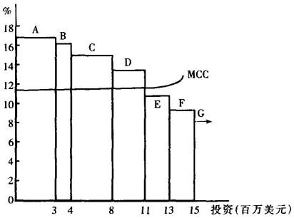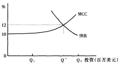 图1 具体的投资方案 资本预算工作对企业未来的发展关系重大,因而要涉及到计划、生产、销售、会计、技术和采购等许多部门的活动。由于投资方案中的收益流量和资金成本的计算中都带有不确定性,因而投资决策是一个十分复杂的过程。 但从经济上讲,所遵循的原则仍为边际原则(边际收益等于边际成本),不过这里的边际收益为投资收益率,边际成本为企业的资金资本。可用图说明这个原则。 图1中横轴为全年投资额,纵轴既表示资金成本的百分数,又表示投资方案的收益率。图1中的长方形为投资方案,例如方案A的支出为300万美元,预期收益率为17%;方案B的支出为100万美元,预期收益率为16%;等等。最后的投资方案G是购买利息率为4%的国库券,购买量不受限制。图2把图1信息概括为一条平滑的投资机会曲线,标为IRR,即内部收益率。 MCC曲线为资金的边际成本,即每多筹集1美元投资所需支出的成本,如图1所示,在企业投资增量1300万美元以前,边际资金成本保持在10%以上,超过1300万美元,资金成本开始上升。企业为了获得最大利润,应采用投资方案A、B、C和D,放弃投资方案E、F、G,即共投资1100万美元。图2表明企业的投资额为Q*美元,在这里资金的边际成本为12%,与最后采用方案的投资收益率相同。
