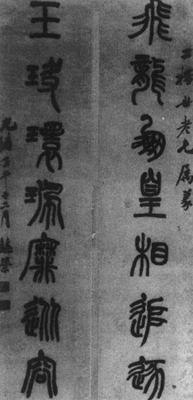 【赏析】: 如果不是王懿荣在作爲药材的“龙骨”上发现甲骨文,那么“甲骨文”的发现可能还要推迟很多年。这是王懿荣对文字学的贡献。 作爲文字学家的王懿荣,其书法也颇有可观。这幅篆书联“飞龙凤皇相追逐,玉玦环珮靡从容”便是明证。 篆书这种书体在淸代得到了复兴。淸代写篆书的人很多,除了那些耀眼的名家外,还有一大批擅写篆书的好手。过去,一直以“玉箸”爲正宗,并且大多採用元吾邱衍的法子,把笔尖烧掉或剪掉笔锋。至邓石如出,面目爲之一新。他用长锋羊毫挥洒自如,起笔处往往可见笔锋,结体气势磅礴,一改以前恹恹无生气的面目。从此篆书的表现力大大加强,形成了崭新的风格。 王懿荣此联结体略方,用笔老辣。起笔处逆锋藏头,收尾凌空收势,致使每个点画皆圆头方尾。转折皆提毫暗过,深得“折钗股”遗意,整幅作品在圆润之余又见淸俊。结体上也很有特点,右偏旁都收缩,左偏旁伸长舒展,如“玦”、“珮”、“追”诸字,在严整的体势中增添了动感。但“龙”和“珮”的左边过分扭屈,有点做作,但小疵并不影响整幅神采。 |