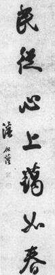 【赏析】: 此行书七言对联,天骨秀成,风神自在。笔意旷达高古,拙巧互用,温润中含挺秀之态。从此作品中能看出,书者能下笔有神,熟而不俗。从笔墨上来看,比较流畅自然,丝毫无矫揉做作之态。运笔筋骨血肉相辅,粗细、长短、曲直穷极变化,复归匀称。顿挫使转变化多姿,线条的使转流畅,如行似走,沉著痛快,娴熟自然。通篇笔意一气呵成。结构比较谨严,比例舒适,呼应巧妙,无雕饰之痕。字形大多呈长方形,体势因字而异,或抱合,或开拓,上下承继变化,左右虚实借让均很妥帖。再从整幅章法布局来看,上下联各七字,略呈欹侧,富有参差错落,呈现出齐而不齐之态。但气势雄强直贯,呈现出一种严谨而自然的艺术效果。 |