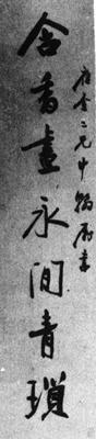 【赏析】: 陈鸿寿此行书《七言对联》,其字笔意形态,皆有摆脱赵(孟頫)董(其昌)之书势气味,而独创新格。此联行书,在古雅中有法度,在精严中见天趣。正如近人杨守敬谓:“行书峭括,而风骨高骞。”这与他的书学渊源密切相关。因他平生致力于临摹《开通褒斜道刻石》,故其书意笔势由摩崖石刻脱胎而出,情趣飘逸,新奇独特。由于他从摩崖刻石中汲取了丰富的营养,使自己的书法有著较大的长进,在字的结体、章法上有著一定的创新。倘仔细观之,即在用笔上採用一种稍带颤抖的笔法,使他的字体呈现出一种浓郁的金石气。 |