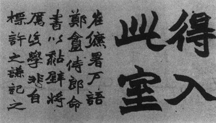 【赏析】: “碑学之兴,乘帖学之坏。”由于“帖学”长期占领著统治地位,“馆阁体”束缚著书法艺术的发展,几乎使之走向僵化的死胡同。物极必反,于是碑学逐兴。完白爲碑学鼻祖,而他的成就主要在于篆隷。在北碑上追求探索,并善于吸收,独闢蹊径,自成面目者,当推撝叔。北碑多出于无名氏的书手和民间刊石的匠人。点画方稜,呆板穿凿,一向使文人墨客闻而却步,望而生畏,从不敢问津。而这些儍板滞呆,死气沉沉的北碑刻石,一经高手的理解发挥,立即变成了生龙活虎的富有生命力的魏碑书法艺术。从赵之谦这幅楷书横披中,可以窥见他在书法艺术上的主要格调。结体的险峻峭拔,抓住了北碑的精髓所在,用笔的活泼自然,打破了碑刻的呆板无神。尤其是他的魏体行书的落款小字,更是洒脱不羁,信手而成,却又不失北碑法度。这足以显示了作者的高妙之处。赵之谦不愧爲一代大师,不愧爲一位天才的书法家。然则,康氏之评,不亦过乎? |