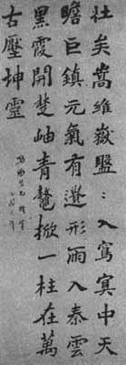 【简介】: 近代·余沙园书。纸本。楷书。凡四行,共五十字。刊于《民国时期书法》(上)。 【赏析】: 学颜书者取其神而遗其形,目的在于以颜书的雄浑气魄作爲自身书法的基调。也有取其形而后揉入其他书体的,爲的是以颜书外形的宽阔来作爲自己作品的形态。余沙园的楷书轴,更凖确地说是行楷,入颜非深,仅具形态,而更多地唱出北碑情调。可惜其笔力不济,字裏行间那种深厚坚实的内在涵量并不能打动欣赏者。不过,我们可以发现,作者在某些方面是表达得十分充分的,如转折之处,沉厚有力,饱满刚劲,衞铄的“劲弩筋节”之誉足以当之。但较多地方却流露出作者不够娴熟的技法,如横画,常见颤抖之处,运行犹豫不决。若比之颜书,其横画起始,耸翘过多,“辶”的书写,亦不够自然,拗峭过分,消失了一波三折的趣致。作者似乎书写得太认眞,过份著力,致使不少字重心欠稳,或者说,书者所欲寄寓之意尙未能调和于手笔之中。这不得不给人们留下一丝遗憾。