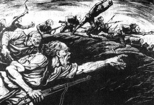 【作品赏析】: 这是组画《怒潮》之一,作于1947年。 画面反映劳苦大众不堪忍受黑暗势力的压迫,起而暴动的场面。黎明时分,暴动的时刻已到,愤怒已极的人们拿起枪、镰刀和长矛,向著一个方向冲去。画面没有描写城镇环境,没有表现对立面,只把人群画在一片坡地上,他们从四面八方聚拢而来,向著坡下,向著压迫者的巢穴,无畏地冲击。他们衣衫褴褛,打著赤脚,但都呐喊著,有如洪流奔泻,不可阻挡。 全画基调是黑,但光亮照耀著人们的脸和手。刀法尖锐、奔放,所有的人都倾成斜线,头发向后跳跃著,那是激动,是仇恨,是力量,是艺术家感情的渲泄。 。【作者介绍】: 李桦(1907- )广东番禺人,1926年毕业于广州市立美术学校,后在该校任教。 从1934年起从事新木刻运动,在广州组织了“现代版画研究会”,并与鲁迅先生取得联系。1935年主编《现代版画》丛刊,1936年负责筹组《第二回全国木刻流动展览会》。历任中华全国木刻界抗敌协会理事,中华全国木刻协会理事长、中央美术学院教授兼版画系主任、中国版画家协会主席、《版画》杂志主编等。 。  现代 李桦 黑白木刻 纵20厘米 横27.5厘米 |