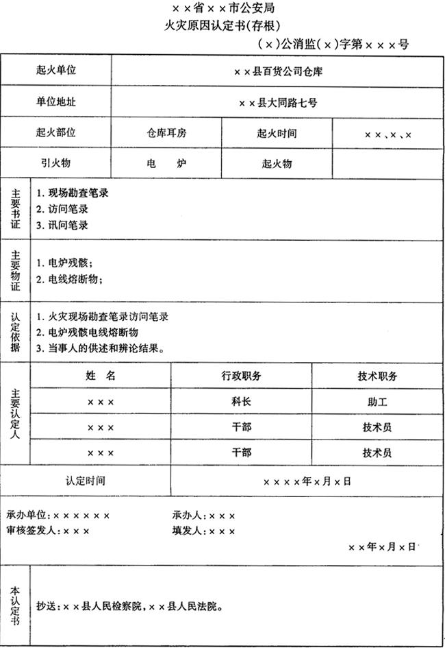 ××省××市公安局 火灾原因认定书 (×)公消监(×)字第×××号 ××××年×月×日×时×分,××县百货公司仓库发生火灾,烧毁库内储存桶装和瓶装酒××万公斤,粉条××万公斤,总价值××万元,我局消防支队火灾调查(技术)人员于×月×日进行了火灾调查。根据火灾现场勘查笔录以及调查访问等情况,经分析研究,作出如下认定: 这起火灾是先从耳房内起火的,起火点就是耳房内办公桌附近一个1千瓦电炉导线,由于仓库保管员×××在紧邻仓库办公室内私自使用电炉,导线超载而且在无保险装置的情况下长时间运行,致使导线燃烧引燃周围可燃物造成火灾。 (盖章) ××××年×月×日 抄送:××县人民检察院,××县人民法院。 火灾原因认定是调查火灾事故的直接目的,也是正确分析和处理事故的基础和依据。火灾事故调查人员或调查组在对火灾现场勘查、调查访问所得的材料进行综合分析后,应向失火单位出具《火灾原因认定书》。其内容可由下述三部分组成: (1)首部 这部分应写明火灾事故发生的时间、地点等基本情况。 (2)正文 这部分应简明扼要地写明火灾原因认定的依据事实、理由;写明认定的起火部位和起火点、起火物和起火源以及认定的火灾性质等。 (3)尾部 这部分应写明填发火灾原因认定书的日期,认定人员的姓名、职务或职称,最后加盖认定火灾原因机关公章。 《火灾原因认定书》具有法律效力,它是依法追究行政责任和刑事责任的依据,也是妥善处理火灾事故损害赔偿的前提。因此,在制作火灾原因认定书时,要求文字简练,事实完整、客观;注意逻辑的严密性;当事人的行为,认定的结论要与所取得的证据相一致。 |