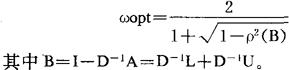 给定线性代数方程组  若aii≠0(i=1,2,…n),则解方程组(1)的超松弛选代程序为:  i=1,2,…n,k=0,1,… 其中 为任意初值。 将A分解为A=D-L-U,其中L,U分别为A的下、上三角部分(不包括对角元素),D为A的主对角元素所构成的对角矩阵,则(2)可写成下列形式: Xk+1=X(k)+ωD-1(b+LX(k+1)-DX(k)+UX(k), 或 X(k+1)=SωX(k)+fω, 其中Sω=(D-ωL)-1((1-ω)D+ωU) fω=ω(D-ωL)-1b 设Sω的特征值为λi(Sw),记 ,当A是实对称正定矩阵时,超松弛迭代程序总是收敛的指X(k)趋向于方程组的解X(*)。而对任意矩阵A,当且仅当ρ(Sw)<1时,迭代程序才是收敛的,且ρ(Sw)越小收敛的越快。因此ω的选取最好能使得ρ(Sω)取最小值,这个最小值所对应的ω称为最佳松弛因子,把它记为ωopt。 若A是对称正定矩阵且具有相容次序,则  |