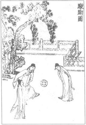 蹴者,足踢的意思;踘,亦作“鞠”,即毬。 《汉书·霍去病传》颜师古注云:“鞠以皮为之,实以毛,蹴蹋而戏也。”刘向《别录》,此戏“或曰起战国时”。至汉代,更为盛行,不仅史籍有记载,而且南阳汉墓出土石刻有蹴踘图。到唐代,始改蹴踘为打毬。封演《闻见记》云:“打毬,古之蹴踘也。近俗声讹鞠为毬,字亦从而变焉,非古也。”此后,“蹴鞠打毬”往往连称。《都城纪胜》有“蹴鞠打毬社”。《梦粱录》:“更有蹴鞠打毬,射水弩社,则非仕宦者为之,盖一等富室郎君,风流子弟与闲人所习也。”《金瓶梅》此回:“王孙争看,小栏下蹴踘齐云。”即指踢毬。  |