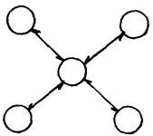 | 释义 | 轮式交往 交往沟通模式中的一种中心化模式。 如下图:人际间的沟通是通过中心人物进行的。中心人物起著一种领导、支配和协调的作用,收集和传递四方的信息。 它的优点是便于集中和统一,传递信息较快,也较有组织性。但群体成员之间相互较少直接沟通,群体气氛不一定协调。 处于中心化模式周围的人,由于只有纵向交往,缺乏横向交往,往往对群众的任务不太热心,责任性差,精神上也不够愉快。他们所处的地位决定了他们主要是被动地接受和传递信息。却较少主动地承担责任。一般生产机构等正式群体中,多采用这种沟通模式,以便于管理。