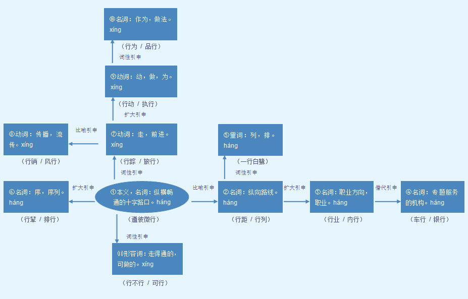 | 释义 | ![]() 义同“行(háng)”❶,用于“树行子” 见“道行” ❶ 行为: 品~|罪~|言~不一。 言 yán 有~在先|~外之意|听其~,观其行。 ❷ 办;做: 试~|~不通|三思而~|各~其是|~之有效。 止 zhǐ 适可而~|学无~境|令行禁~。 ❸ 行走: 日~千里|读万卷书,~万里路。 止 zhǐ 行~容日后面禀。 ❶走。作带宾、带补谓语。宾语常由“路”充当,补语常由数量词组充当。 读万卷书,~万里路|排字工人日~千里不出门|水太浅,~不得船。 ❷做;办。多用于口语。可重叠。作谓语,可带宾语、补语。 你~~好,让她走吧!|请您~个方便|这一套~不通。 ❸可以。 a.作谓语。 事情这样办就~了。 b.作独立成分。 ~,你就这样办吧。 能干。作谓语。 这个人真~|从试用阶段看,他确实很~。 【近】 〈动〉❶走 ❷做 办 ❸好 【词语】 行程 行贿 行迹 行将 行将就木 行劫 行径 行军 行乐 行礼 行李 行猎 行令 行囊 行期 行乞 行人 行若无事 行事 行色 行商 行尸走肉 行时 行使 行事 行书 行署 行文 行销 行星 行刑 行凶 行医 行云流水 行政 行装 行踪 行走 【注意】 ❶另见háng。 ❷又读hàng,如:树行子;又读héng,如:道行。 ❶行列。 a.作主语。 大田栽秧~对行。 b.作宾语。 柳树成~|她让孩子们排成单~。 ❷行业。可重叠。可同“一”“各”等组合。 a.作主语。 各~各业|~~出状元。 b.作宾语。 干一~,爱一~|从空军部队转业后,他改了~|记者跟教师隔了~啦! 用于成行的东西。可重叠,也可构成数量词组作相应的成分。 a.作定语。 `14~诗|8~书(字)|10~纸|一~~诗充满了对祖国的爱。 b.作主语。 这几~一会儿就写完了|进行队列训练时,每班排成四行,每~都是整整齐齐的。 c.作宾语。 这份报告他只看了两~,就丢进了抽屉。 【辨】 行和排:均有行列的意思,但“行”指竖着的行列;“排”则指横着的行列。 【词语】 行帮 行车 行道 行规 行话 行会 行间 行距 行款 行情 行市 行伍 行业 【注意】 另见xíng。 字源解说 行(hÁng),甲骨文 附 文言版《説文解字》:行,人之步趨也。从彳,从亍。凡行之屬皆从行。 附 白话版《说文解字》:行,人们在路上行走或小跑。字形采用“彳、亍”会义。所有与行相关的字,都采用“行”作边旁。 引申线索 ![]() 【字族索引】 行 亍 【同音字】 háng hàng héng xíng |