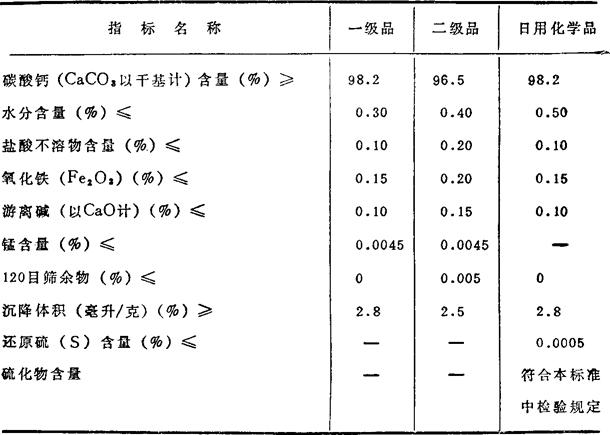 | 释义 | 轻质碳酸钙 本产品是用沉淀法制得的粉状碳酸钙。 1.质量标准 表1-55 轻质碳酸钙质量标准(HG1-517-74)