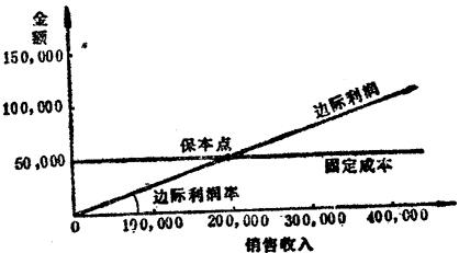 | 释义 | 边际利润图 亦称“边际贡献图”、“贡献毛益图”、“创利图”。 反映销售收入和边际利润二者关系的坐标图。利用该图可以清楚地看到一定的销售收入所能获得的边际利润,是企业了解和预测利润的一个有利工具。 在边际利润图上,一般以横轴表示销售收入,以纵轴表示边际利润的金额。其绘制方法是:首先在纵轴上找出固定成本的截距,并从此处画一条平行于横轴的水平线,为固定成本线;其次计算保本销售收入,并找出保本销售收入与固定成本相对应的点,再从原点过此点画一条直线,为边际利润线。 边际利润线与固定成本线的交点为保本点。保本点右面的边际利润为正数,保本点左而的边际利润为负数。 例如:某企业生产甲产品,销售单价为400元,单位变动成本为300元,全月固定成本总额为50,000元:
