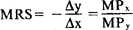 边际技术替代率在等产量曲线图上表现为等产量曲线的斜率,其公式表示则有,其中△y和△x分别为要素y与要素x的变动量,MPx与MPv分别为要素x与要素y各自的边际产品。因此,两种要素之间的边际技术替代率等于它们的边际产品比例的倒数,在均衡条件下又等于它们的价格比例的倒数。根据边际产品递减规律,有边际技术替代率递减规律。