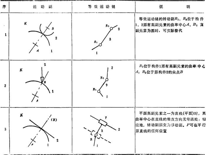 | 释义 | 运动副的替代 在机构的分析与设计中,有时可以用两构件间的运动链来替代某种运动副,而保持原有相对运动,在分析中进行替代,有时可以使问题简化;设计中的替代,有的是为了增大承载能力,有的是为了便于制造。几种运动副的等效运动链及其等效条件说明见表5.1-3。 表5.1-3 运动副的等效运动链