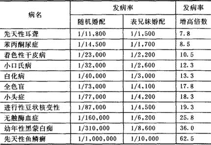 是指三代之内有共同祖先的个体互相之间结婚。 我国新婚姻法规定:“禁止‘直系血亲和三代以内的旁系血亲’结婚”。之所以要禁止近亲结婚,是由于亲缘之间相同的基因较多。一级亲缘间(即父女,母子或同胞之间的关系)有1/2基因是相同的;二级亲缘间(指祖孙或伯、叔、舅或姑、姨与侄、甥之间的关系)有1/4基因是相同的;三级亲缘间(指堂、兄妹、姨表、姑表、舅表兄弟姐妹之间关系)有1/8基因是相同的。 近亲结婚后,致病基因组成纯合子的机会多,从而使隐性遗传病的发病率增高。 在实际每个正常人都可能带有五六种隐性遗传病基因。由于非近亲结婚,相同的基因机会少,致病基因组成的纯合子机会少,因而不表现出病态。 据调查统计,近亲结婚所生子女遗传病的患病率,为非近亲结婚(即随机婚配)所生子女的几十倍,甚至百倍。因此必须杜绝近亲结婚(见表)。 近亲婚配隐性遗传病的发病率