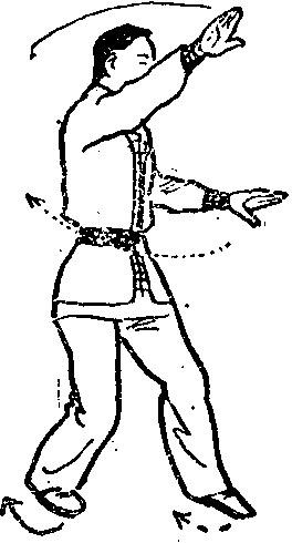 右脚后撤一步,两手双分,退步时重心集中于右足。要求虚领顶劲,使脊背的劲力在身体拧合之中通达于两臂的手掌,以保持平衡。