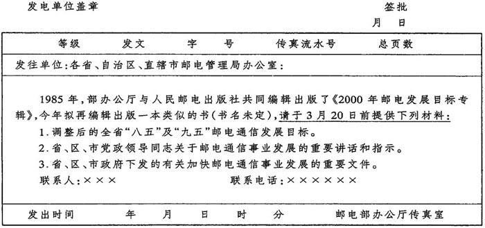 邮电传真电报主要用于传达命令、通知等重要文件,特点是:传达迅速,反馈敏捷。传真电报按发文机关等级可分为三种:部发传真电报、局发传真电报和处发传真电报。传真电报一般要先写标题,如“关于保障防汛期间通信的通知”,“关于解决兑款难等问题的通知”等,然后拟写事由。部发、局发传真电报需经部、局领导签发,加盖公章;处发传真电报需经处室领导人签发,加盖处室公章。制发传真电报须注意以下事项:1.非重大、紧急事项不宜制发。2.要严格掌握方针政策。3.文字要简练,字迹要清楚均匀,用黑色墨水书写,也可打印。4.统一使用“传真电报”用纸。