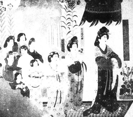 | 释义 | 都督夫人太原王氏礼佛图 【作品赏析】: 这幅画是唐代供养人画像中规模最大的一幅,共画了十二个人像,第一身像最大,立粉堆金榜题为“都督夫人太原王氏一心供养”;第二身像较小,墨书题“女十一娘供养”;第三身像更小,墨书题“女十三娘供养”。 这三人是礼佛图的主人,后面九人为奴婢。王氏礼佛图的对面墙壁上,也绘有一幅与此幅同样大的男像礼佛图,全图八人,第一身立粉堆金榜题为“朝议大夫使持节都督晋昌郡诸军事守晋昌郡太守兼墨离军使赐紫金鱼袋上柱国乐庭瓌供养时”。晋昌郡在敦煌东今安西境,设郡在唐天宝元年至乾元元年(742-758),乐庭瓌于天宝五年出任都督。太原王氏是乐庭瓌夫人,礼佛国的绘制时间也当在天宝五年至乾元元年(746-758)。 都督夫人礼佛图中的三位主要人物,以王氏的画像最大,身量超过真人。两鬓包面如抛家髻,头顶饰“朵子”、鲜花、小梳、宝钿,穿碧衫红裙,肩披绛地帔子和白罗画帔,脚登笏头履,持巾,捧香炉,虔敬向佛。 次为女十一娘,面饰花钿、花子,著朱衫白裙。再次为女十三娘,头戴凤冠,斜插步摇,衫裙帔帛,“小头鞋履”。 她们都是遍身绮罗、满头珠翠,一望便知为豪门贵族眷属。九身附属人物,均为奴婢,身份卑微,无榜题。其中一身饰抛家髻、著衫裙帔帛,持纨扇,年龄较长,似为奴婢之首。其余八人均著圆领衫,腰束带。 在唐代,宫女奴婢著男装者,多戴幞头,这在唐人《虢国夫人游春图》、《纨扇仕女图》、《送子天王图》以及永泰公主墓壁画中均可见到。这种“束装似男儿”的装扮,正是天宝年间兴起的奴婢的时装。八人中有四人鬓垂双鬟,这是未成年女童的发式,另三人均于发髻上戴秀额罗幞头,这就是唐诗中所谓“新装巧样画双蛾,漫裹恒洲秀额罗”。 这幅画人物造型真实,富于生活气息,无论主人还是奴婢,都具有“曲眉丰颊”、“丰肌腻体”的“杨贵妃型”的特点。但每个人的面容神采又各不一样:主人们雍容华贵,手捧香炉或鲜花,合掌敬礼,流露出恭谨虔诚的心情;奴婢则有的捧琴,有的端水瓶,有的两眼前视,有的以纨扇掩面,悠然自得。有的回头顾盼,窃窃私语,与主人的肃穆相比则显得心情颇为活泼,深刻地表现了生活的真实。 这幅画的线描“流动如生”,属于吴道子一派兰叶描。不仅线的形态颇有变化,在用线的安排上注意主辅结合,线的疏密和虚实变化都比较考究,塑造了形象生动、性格鲜明、生气蓬勃的唐代美人。 更可贵的是,这幅画的结构和意境创造上,突破了前代整齐严肃的供养人行列,人物位置参差错落、自由活泼,特别是在人物背景的设计上出现了垂柳、萱花、曼陀花,并有蜂蝶绕花飞翔,使庄严静穆的环境增添了动的情趣,收到动静结合、相得益彰的艺术效果。 这样的巨型画幅,在敦煌石窟供养人画像中仅此一例。 。