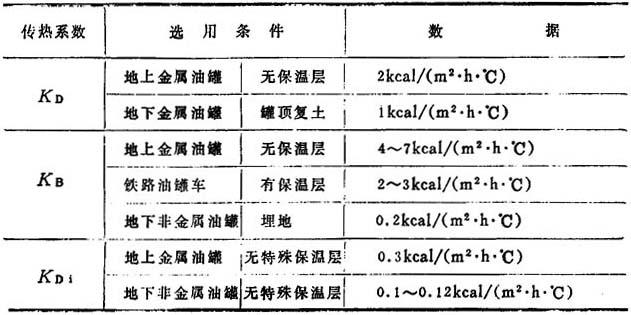注:1kcal=4.1868kJ FD——罐顶的表面积,m2,对于铁路油罐车和卧式油罐车、取FD=0; ty——油品的平均温度、℃; to——周围介质的温度、℃。 qB——经罐壁散失的热量: qB=KBFB(ty-to)(kJ/h) (3) kB——油品经罐壁向空气的传热系数,kJ/(m2·h·℃),按表14—2-71选取; FB——罐壁的表面积,m2、对于铁路油罐车和卧式油罐,按罐体的全部表面积计算。 qDi——经罐底散失的热量: qDi=KDiFDi(ty-to)(kJ/h) (4) KDi——油品经罐底向土壤的传热系数,kJ/(m2·h·℃),按表14—2—71选取。 FDi——罐底的面积、m2,对于铁路油罐车和卧式油罐,取Fyi=0 将公式(2)、(3)、(4)代入(1)得立式油罐散热损失的热量计算公式: Q2=(KDFD+KBFB+KDiFDi)(ty-to)(kJ/h)(5) 将公式(2)、(3)及(4)整理后得铁路油罐车和卧式油罐散热损失的热量计算公式: Q2=KBFB(ty-t0)(kJ/h) 上述公式中周围介质温度取最冷月份平均气温,对于地下或半地下式油罐取埋入地区土壤的平均温度。 油品的平均温度to,在贮油罐中加热时取